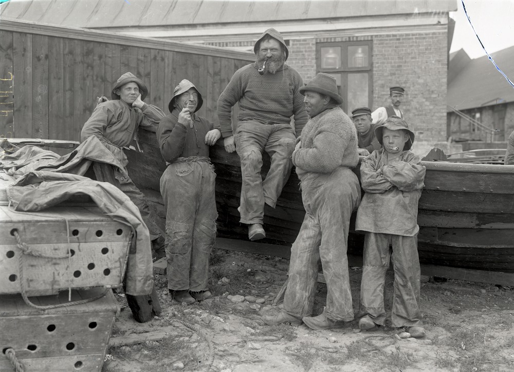 Grupporträtt av fiskare på Råå. Mitt i bild sitter en man på kanten av en båt som ligger uppe på land. Han har skägg och i ena mungipan en pipa. Vänster om honom står två män och lutar sig mot båten. Åt höger i bild står ytterligare en man samt en pojke. De lutar sig också mot båten. Mellan dem skymtas en ung man som står på andra sidan av båten. En bit bakom honom står en man till. I bakgrunden, till vänster i bild, löper ett plank. I bakgrundens mitt finns ett tegelhus och åt vänster, på andra sidan gatan, skymtas ett korsvirkeshus. I förgrunden, på bildens vänstra sida, står ett par trälådor med borrade hål. Över lådorna ligger någon typ av textil, möjligen någon form av överdrag eller segelduk.