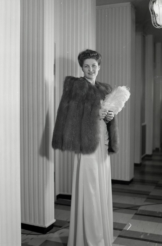 Excellas mannekänguppvisning på Hotell Mollberg. Fotografi av en mannekäng iklädd en hellång, ljus klännning. Över axlarna har en en cape, eller bolero, av päls. I händerna håller hon en stor, vit fjäder.