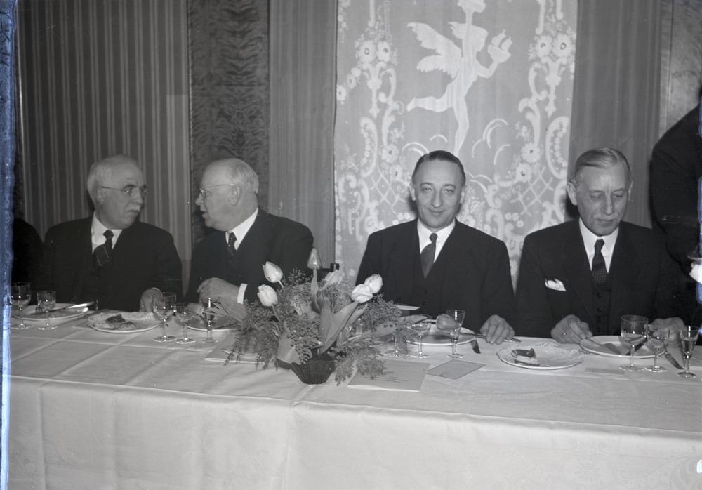 Fotografi av fyra män, iklädda kostym, sittande vid ett middagsbord under Köpmannaförbundets jubileum på Grand Hotell 1944. En av dem tittar in i kameran och ler.