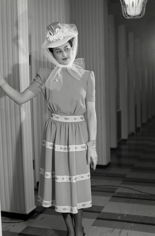 Excellas mannekänguppvisning på Hotell Mollberg. Fotografi av en mannekäng iklädd en knälång, ljus klänning med bårder på kjolen och i midjan. Hon har även hatt och handskar.