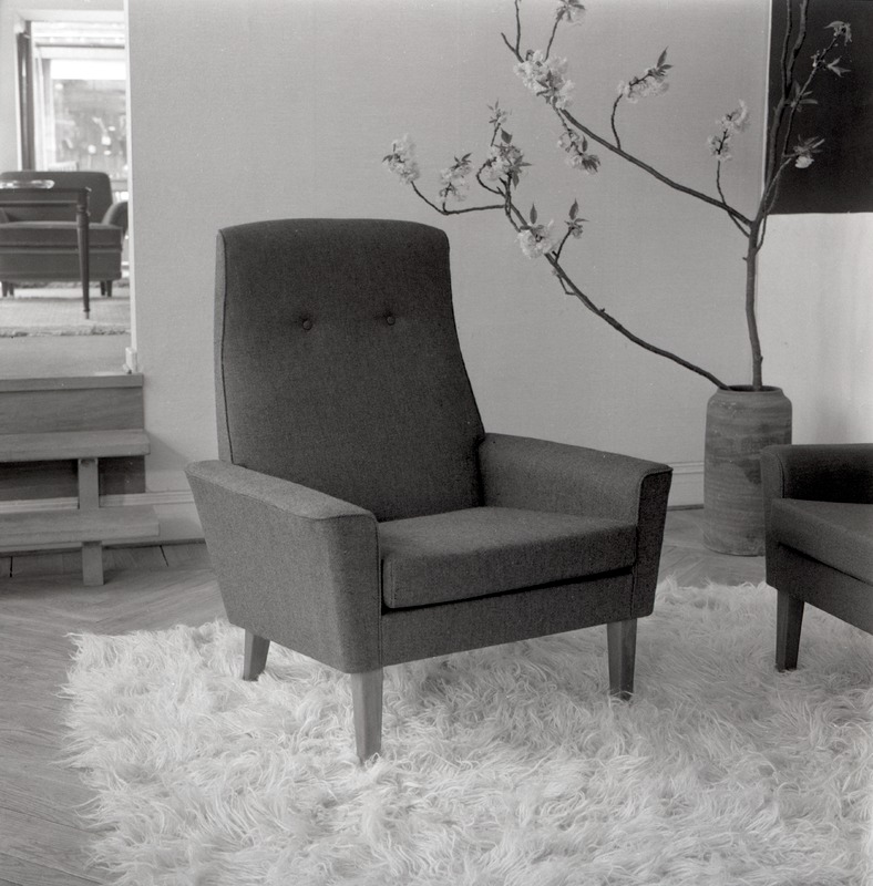 Fotografi av möblemang i Askerheim & Hanssons möbelaffär. Troligen fotograferat vid framställande eller nedmontering av möblemanget som avbildas på nr. 4120-2012:a. I mitten av bilden står en fåtölj. Snett bakom denna, till höger, en blommande trädgren i en vas på golvet. Till höger om denna syns en bit av en soffa. På golvet ligger en ljus, fluffig matta. Till vänster om fåtöljen leder en liten trappa till nästa rum där en fåtölj och ett soffbord skymtar.