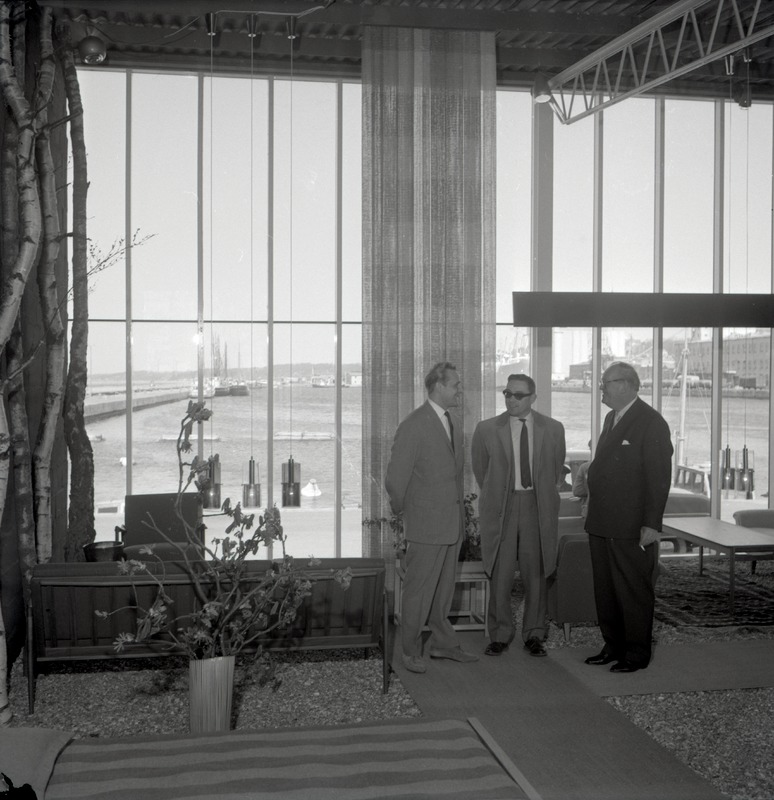 Fotografi av Askerheim & Hanssons utställning i paviljong på Parapeten. I utställningen står tre män som ser ut att prata med varandra. I förgrunden syns en säng. Till vänster om männen står en soffgrupp och till höger fåtöljer samt ett soffbord. Utanför fönstret syns delar av parapeten och hamnen.