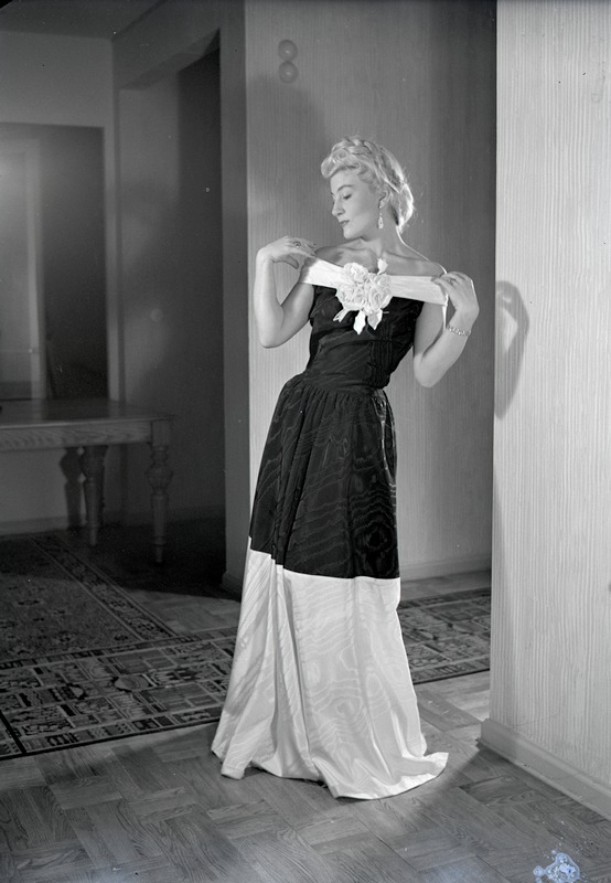 Excellas mannekänguppvisning på Hotell Astoria. Fotografi av en mannekäng iklädd en hellång klänning i både mörkt och ljust, eller vitt, tyg. Bakom henne ligger två mattor och intill väggen längst bak, till vänster i bild, står ett soffbord. På väggen hänger en spegel.