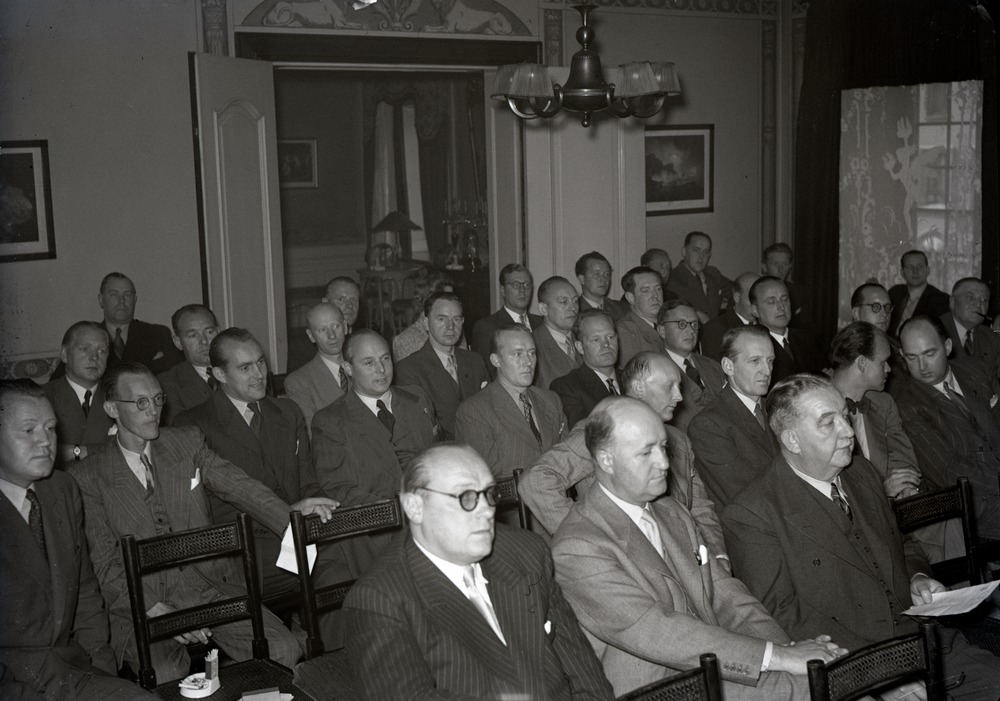 Ett större antal män sitter på fem stolsrader, alla är vända åt samma håll, under Skånes konditorförenings möte på Grand Hotell 1944.