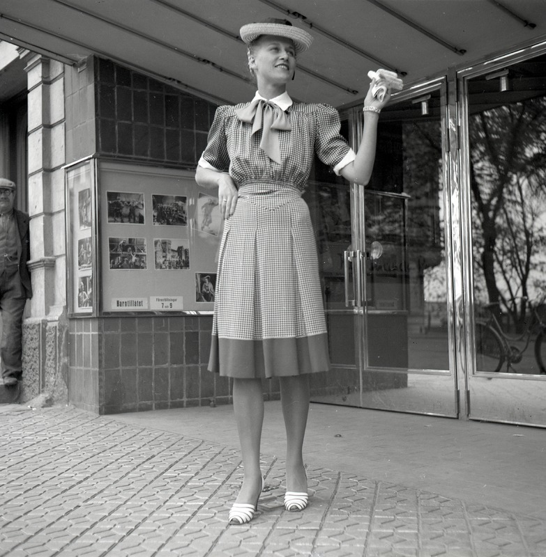 Excellas mannekänguppvisning på Saga. Fotografi av mannekäng stående på trottoaren utanför biografens entré. Hon är klädd i en smårutig, knälång klänning. Hon har även hatt, klackskor och håller ett par ljusa handskar i sin vänstra hand. Snett bakom henne, till vänster i bild, står en man i en dörrpost. Han ser ut att titta mot mannekängen och fotografen.