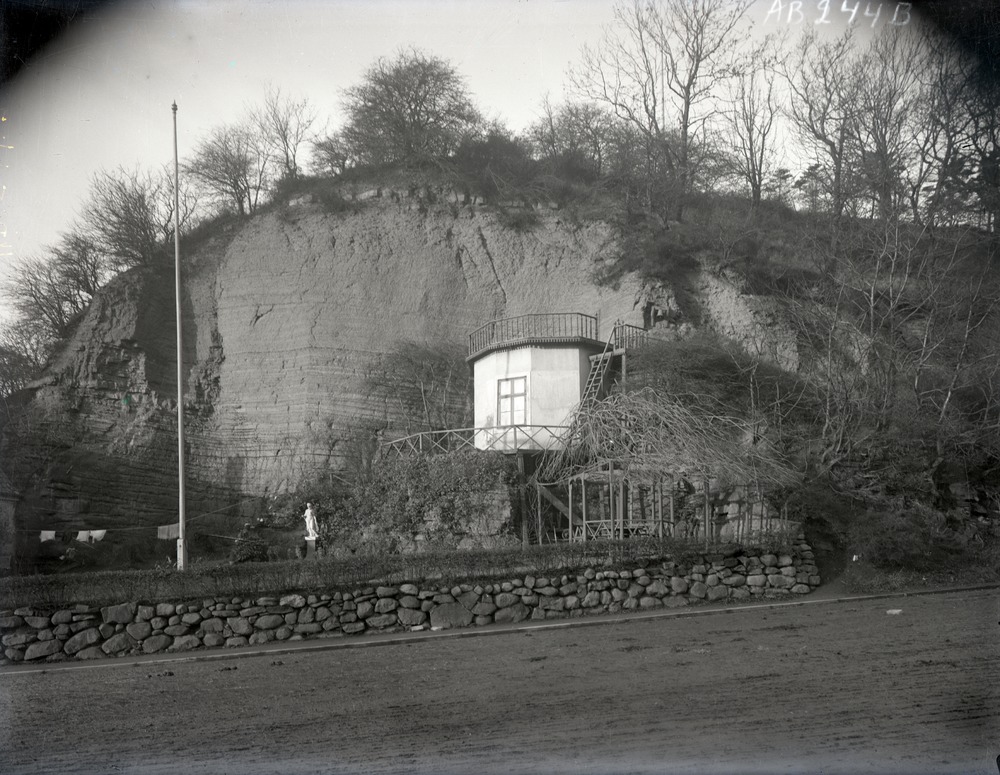 Fotografi av trädgården tillhörande Hälsovägen 11. Trädgården ligger på gatans norra sida. Fotografen har stått på gatans södra sida. Tomten avgränsas mot gatan med en stenmur samt en häck. Inne i trädgården, till vänster i bild står en flaggstång och en ljus staty av en person i helfigur på en mörk piedestal. Till höger om dessa finns en upphöjd paviljong. Paviljongen ser ut att vara byggd mot Landborgen, som avgränsar hela trädgården, åt norr. Den omgärdas av ett staket med någon form av uteplats. En brant stege, eller trappa, leder upp till paviljongens tak som även detta är inhägnad med staket. Bakom flaggstången, intill bergsväggen, hänger en tvättlina med lite tvätt.