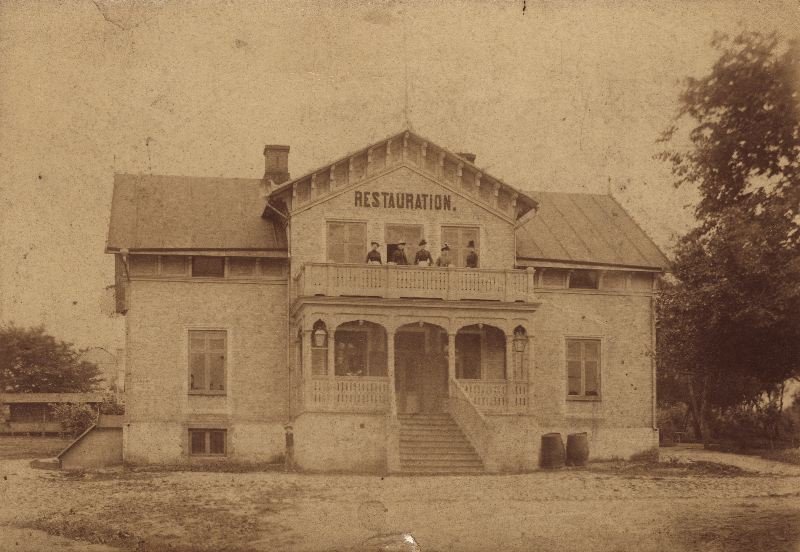 Bild av en villa där det står Restauration, huset har två våningar med balkong ovanpå en veranda, några damer står på balkongen.