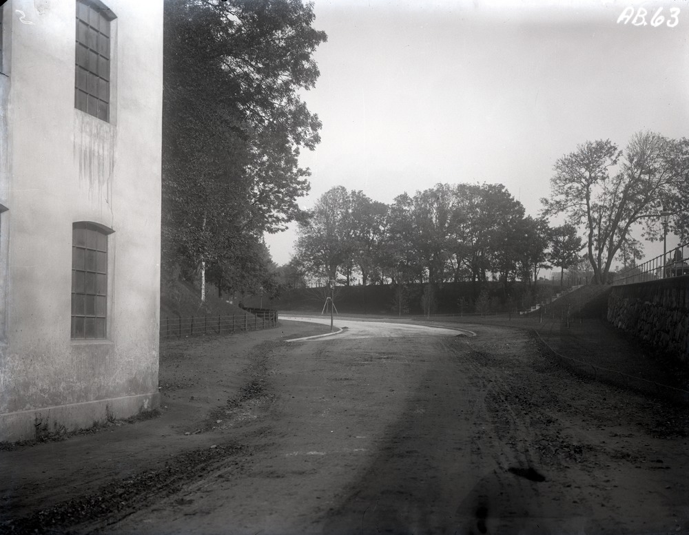 Fotografi som visar ena hörnet av Rössels Kassaskåpsfabrik när denna låg på Pålsjögatan. Fabriken syns till vänster i bilden. I mitten löper en väg och på andra sidan denna en stenmur. I bakgrunden syns ett antal träd på en upphöjning. Till höger om dessa leder en trappa upp på gatan som ligger ovanför muren. Uppe på gatan skymtar en hästdragen vagn.