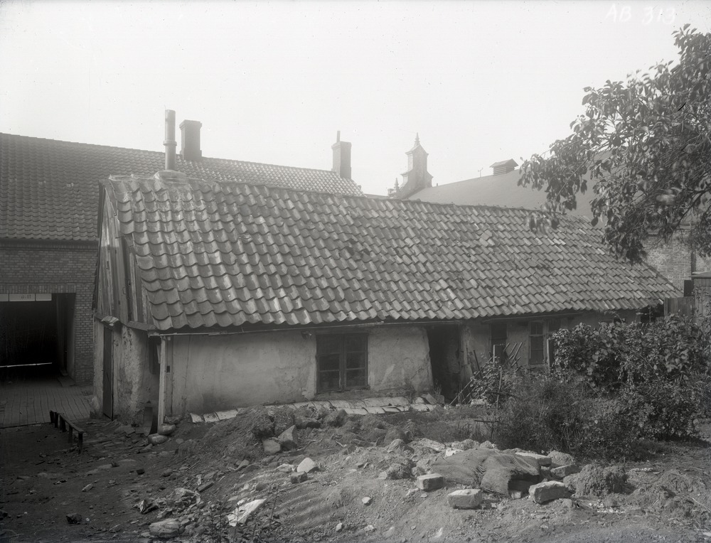 Fotografi av gårdsinteriör på Fågelsångsgatan 6. I bildens mitt finns ett lågt, putsat enplanshus som ser ut att vara i mycket dåligt skick. Framför huset, i bildens förgrund, finns några buskar, ett träd och jord som ser ut att ha flyttats på eller rörts runt i. Ett antal stenar ligger utspridda och något som ser ut som en jutesäck ligger också på marken. Bakom huset, åt vänster i bild, skymtar ett tegelhus och portgången ut mot gatan. Porten är stängd. Taket på en annan byggnad syns åt höger i bild.