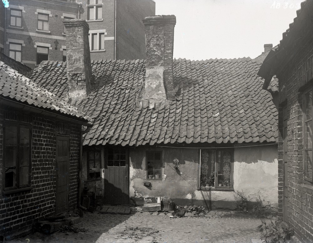Fotografi av gårdsinteriören på Prästgatan 16. Mitt i bild ligger ett lågt, putsat enplanshus med tre stora skorstenar på taket. Som flyglar till detta hus löper två tegelbyggnader ut åt vardera vänster och höger i bild. Mellan dessa tre byggnader finns en kullerstensbelagd innergård. I bakgrunden, åt vänster i bild, syns två flervåningshus i tegel.