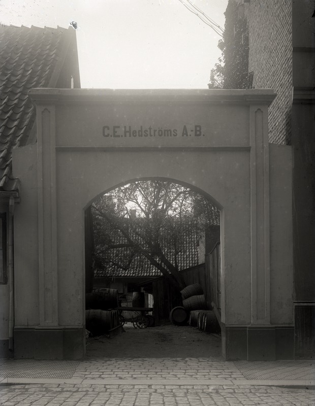 Fotografi av inkörsporten, från Norra Storgatan, till Hedströmska gården och Béenska huset. På portvalvet står det målat ”C.E.Hedströms A.-B.”. Porten är öppen och på innergården syns ett flertal tunnor, en vagn, ett träd, ett skjul och byggnaden på andra sidan gården. Längs med Norra Storgatan, på varsin sida om porten, skymtar Béenska huset till vänster och en flervåningsbyggnad till höger.