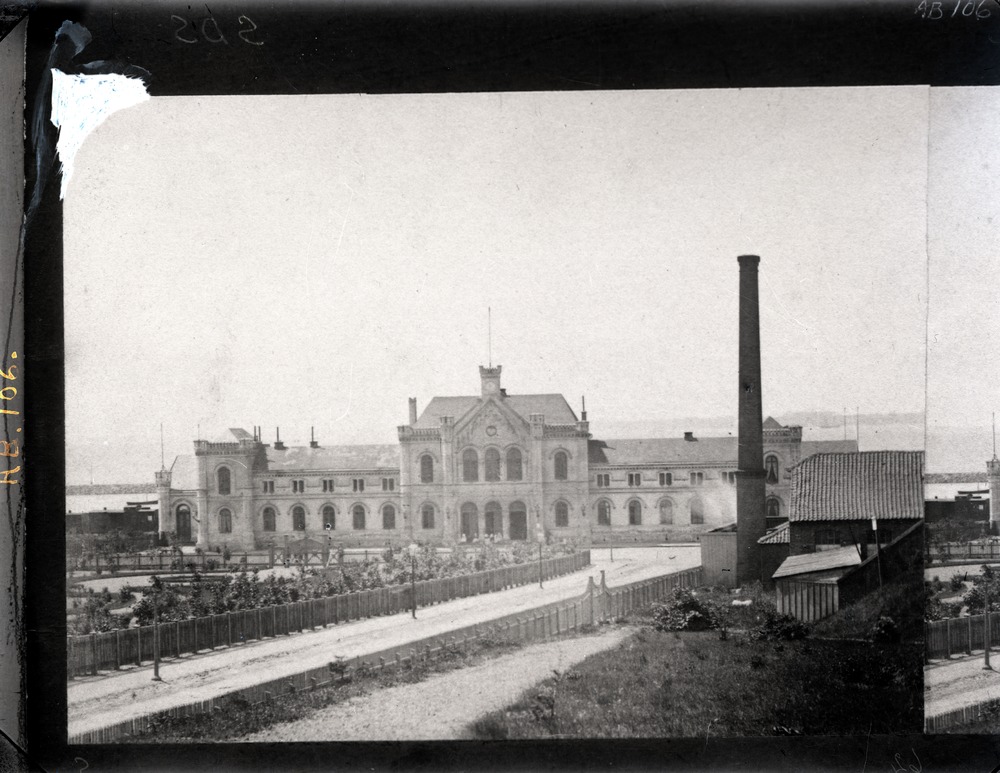 Avfotograferat fotografi som visar Centralstationen på 1870-talet. Framför stationen löper Järnvägsgatan och Trädgårdsgatan. På vänster sida om Trädgårdsgatan syns vad som ska komma att bli Stadsparken. Till höger delar av Ruuthska bruket.