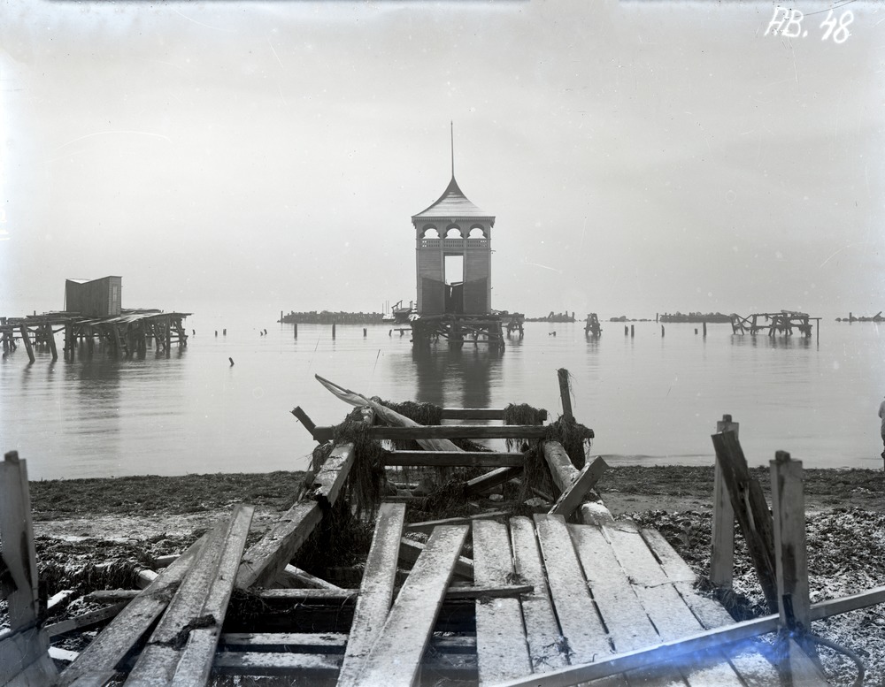 Fotografi av vad som är kvar av Pålsjöbaden efter julstormen 1902. I förgrunden syns resterna av bryggan på stranden. Ute i vattnet syns det lilla som är kvar av kallbadhuset. Ute på Öresund är det dimma.