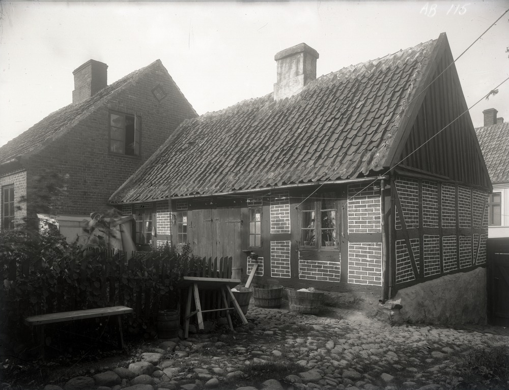 Fotografi av ett hus och dess innergård på Långvinkelsgatan. Till höger i bild syns gatporten. Marken på gården är belagd med kullersten. Framför huset, till vänster i bild, finns vad som ser ut att vara ett trädgårdsland. Detta är inhängnat med ett staket. Huset är ihopbyggt med nästa hus som syns till vänster i bild.
