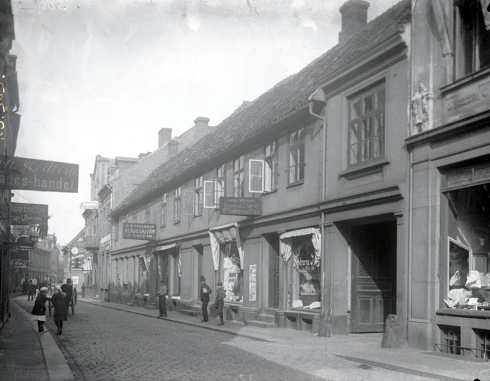 Fotografi av Kullagatan taget åt norr. Till höger i bild, på gatans östra sida, ligger porten in till Gamlegård. I samma hus, med adressen Kullagatan 8-10, ligger ett flertal butiker. Från fasaden hänger två skyltar ut över trottoaren. På dessa står det ”Anna Weisse Manufaktur & Sybehörsaffär” samt ”N.P. Paulsson Klädesaffär & Hattar”. Över flera av husets skyltfönster finns markiser monterade. På trottoaren står en man och två pojkar. Från en fasad längre bort på gatan hänger det en skylt där det står ”Nina Johansson & Co. Fotografiatelier”. På andra sidan gatan finns fler butiker. På tre av skyltarna som hänger ut över trottoaren går det att utläsa ”…Hedberg Klädes-handel”, ”Marie Lindblom Paraply &….” och ”Helsingborgs Kafferosteri…”. På trottoaren går två flickor som båda vänder sig om och tittar mot fotografen. Framför dem, längre in i bild, drar en man på en vagn. Längre neråt gatan syns fler människor och byggnader på båda sidan gatan.