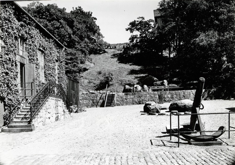 Bilden föreställer stadsmuseets gård med Möllebacken i bakgrunden. Gårdsplan i förgrunden med utställt ankare samt fornlämningar, hällristningar på stenar i formation på gården.