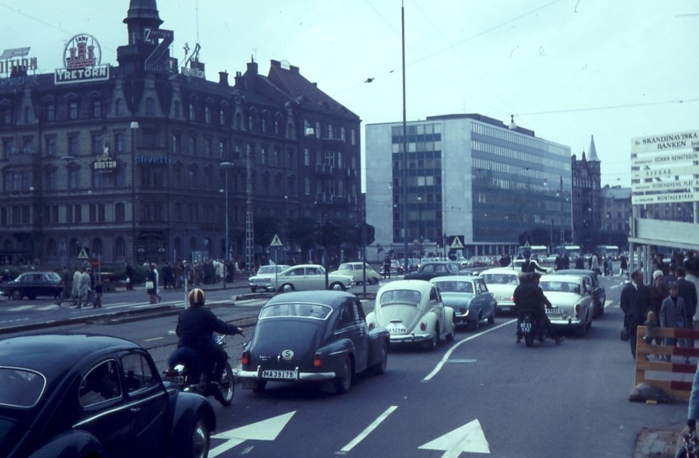 Fotografi taget i samband med högertrafikomläggningen 1967. På bilden syns den trafikerade Drottninggatan, med högertrafik. I bakgrunden syns Stadshuset, längre bort också Sundstorget.