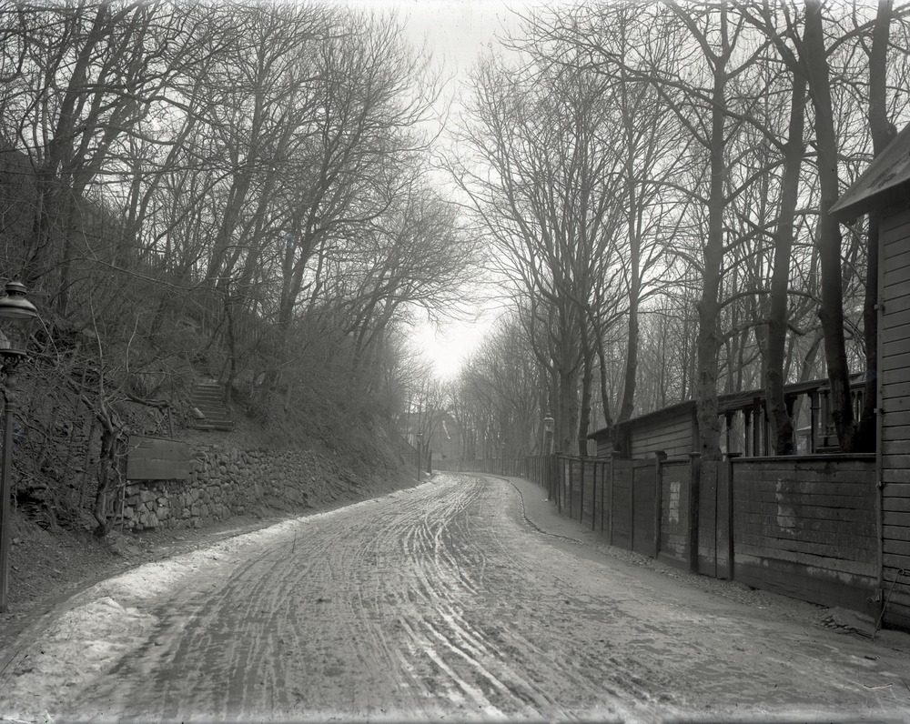 Fotografi av Hälsovägen innan utvidgningen. Det ligger lite snö i vägkanten och vägbanan ser både isig och lerig ut. På båda sidor om vägen står en stor mängd träd. Till vänster i bild syns en del av landborgen. Till höger om vägen löper ett träplank uppför backen. Bakom detta skymtar ett par mindre trädbyggnader.