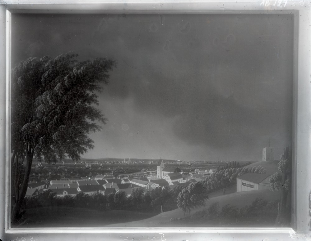Avfotograferat måleri, troligen en oljemålning, som avbildar en utsikt över Helsingborg sett söderifrån.