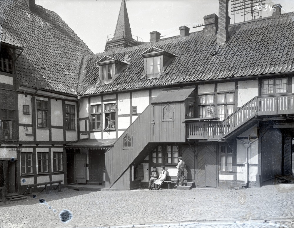 Fotografi av Henckelska gårdens gårdsinteriör. Till vänster i bild ligger huvudbyggnaden som vetter ut mot Norra Storgatan. Till höger byggnaden som vetter ut mot Springpostgränden. Båda är korsvirkeshus. I det högra huset tittar en kvinna ut genom ett öppet fönster på andra våningen. Under trappan som går utanpå fasaden sitter två män på en bänk och en tredje står bredvid. Längst till höger i bild skymtas porten ut mot gatan. I förgrunden finns den kullerstensbelagda gårdsplanen.