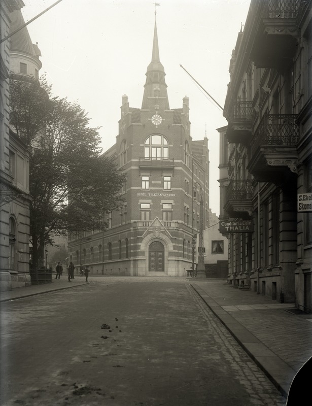Fotografi, taget åt öster, av Kungliga Telegrafstationen i korsningen Prästgatan-Carlsgatan. I förgrunden ligger Prästgatan. Det ligger flervåningshus på båda sidor gatan. På gatans södra sida finns flera balkonger. I ett av husen, på bottenplan, ligger Conditori & Café Thalia. På gatans norra sida växer ett högt träd intill det sista huset innan korsningen med Bruksgatan. Intill på trottoaren och ute på gatan står ett antal män och pojkar. Mitt i bild, där gatan delas upp i Carlsgatan och Prästgatan, ligger Telegrafstationen.