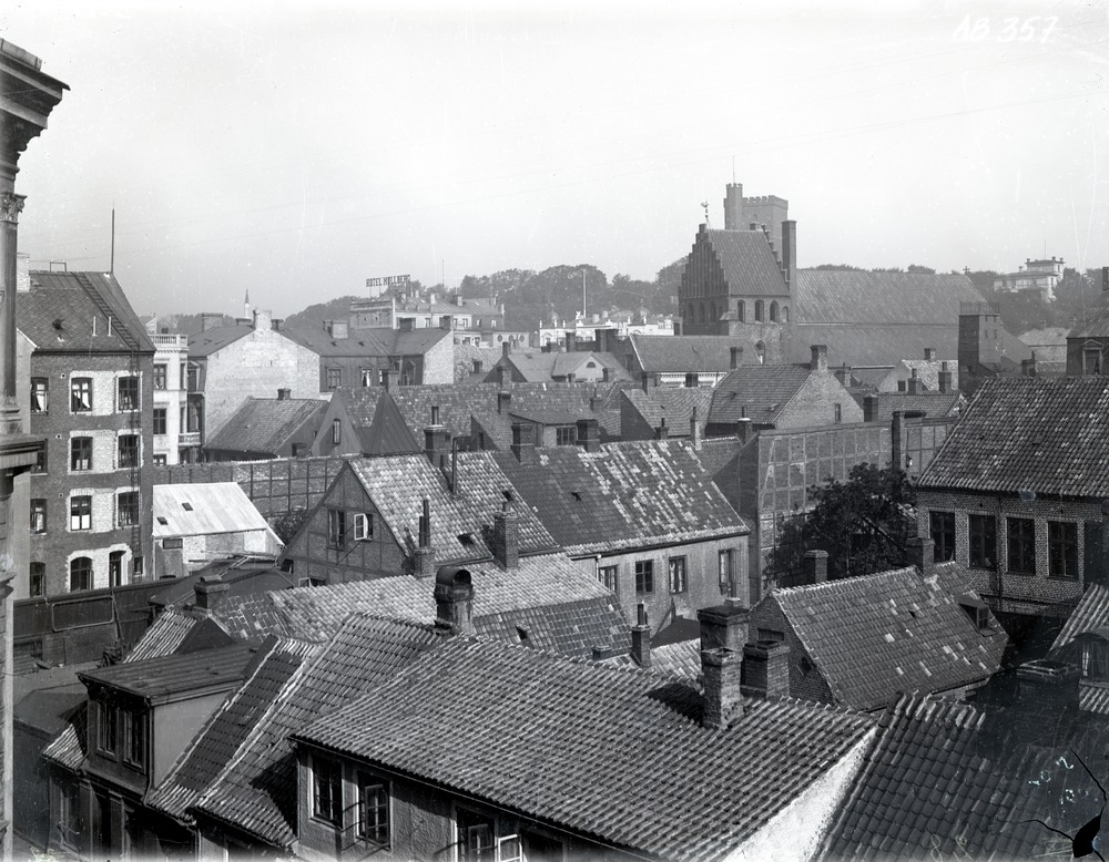 Fotografi av utsikten åt nordost från Hotel d’Angleterre. På bilden syns en stor mängd byggnader, bland annat i kvarteret Unionen. Mariakyrkan syns till höger i bild och i bakgrunden syns Kärnan och delar av Landborgen. Lite åt vänster från bildens mitt syns också Hotell Mollbergs takskylt.
