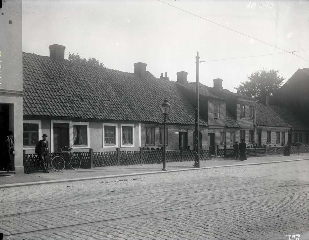 Fotografi av Södergatan. Fotografiet är taget åt sydost från gatans motsatta sida. I förgrunden syns gatan med spårvägsspår i mitten. En rad av enplanshus ligger på gatans östra sida. Framför dessa finns korslagda staket som skiljer tomterna från trottoaren. Längst till vänster och längst till höger i bild skymtar två högre byggnader. I en dörrpost till det högre huset på vänster sida står en man. Nära honom, lutad mot staketet och med en cykel bredvid sig, står en annan man. Långt åt höger i bild går en kvinna förbi en pojke. Även han lutar sig mot staketet.