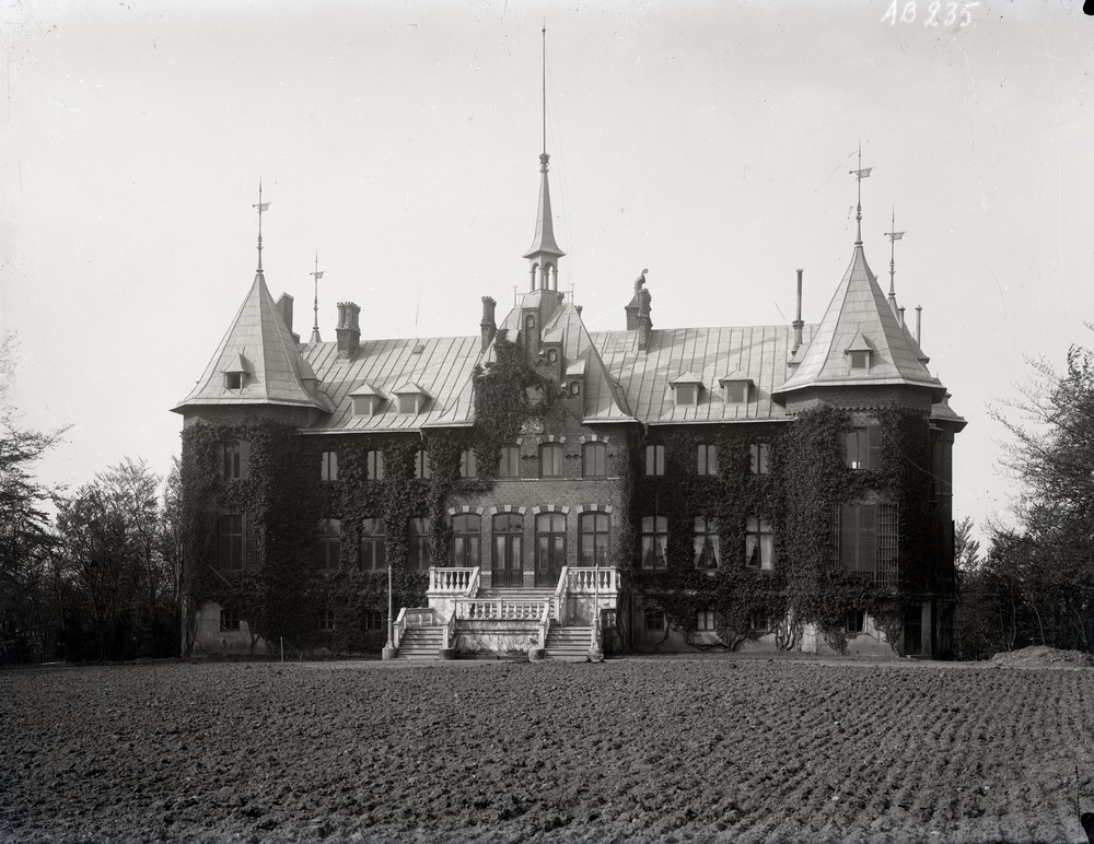 Fotografi av Sofiero slott. Fältet framför slottet är harvat. Till höger och vänster om byggnaden syns träd och buskar.