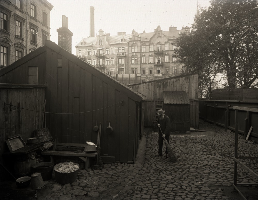 Fotografi av Carl Bohle när han sopar sin kullerstensbelagda bakgård på Drottninggatan. Till vänster i bild, i ett hörn bildat av ett plank och gaveln på ett träskjul, finns en mängd saker såsom en träbänk, zinkbaljor, korgar och kvastar. Ett par kastruller är upphängda på gaveln. Framför skjulets framsida står Bohle och sopar. Bakom honom syns vad som troligen är ett utedass, placerat mot gaveln på ytterligare ett träskjul. Åt höger syns ännu ett plank och i förgrunden syns delar av en träkonstruktion, möjligen en hönsgård. På andra sidan planket står ett antal träd. I bildens bakgrund syns ett antal flervåningshus och bakom dem en hög skorsten.