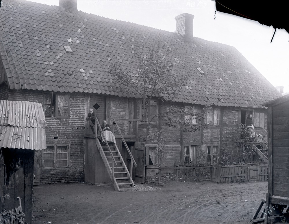 Fotografi från gamla Ruuthska bruket. I förgrunden syns en gårdsplan samt två mindre byggnader, en skymtas till vänster och en till höger i bild, framför ett tvåvåningskorsvirkeshus. Huset har två trappor som leder upp till ingångar på andra våningen. Högst upp på den vänstra trappan sitter en kvinna och bakom henne står en pojke som tittar in i kameran. På toppen av den högra trappan står en annan kvinna. Mellan trapporna, intill husväggen, finns små inhägnader, buskar samt ett träd.