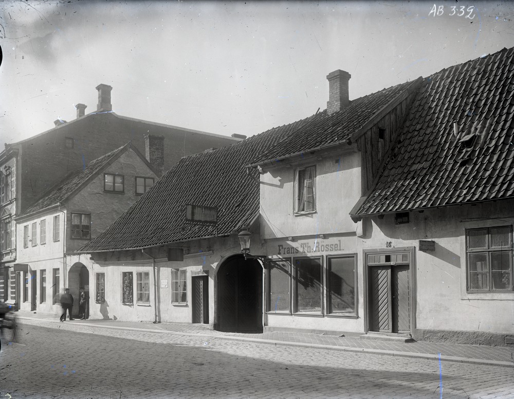 Fotografi av Södra Storgatan 16. Vid dörren längst åt höger i bild finns en skylt där det står ”Anna Olsson Tvätt & Strykning”. Dörren står lite på glänt. På dess vänstra sida finns tre skyltfönster och därefter en stor port. Ovanför skyltfönstren står det ”Frans Th. Rössel.” och bredvid porten hänger en gatlykta på fasaden. En skylt hänger ut från nedre delen av taket. Det som går att utläsa från skylten är ”Frans Th. Rössels Smides &….”. Vid husets slut finns ytterligare en port. Vid den står några män som ser ut att föra ett samtal. Därefter, längst till vänster i bild, syns två hopbyggda flervåningshus.
