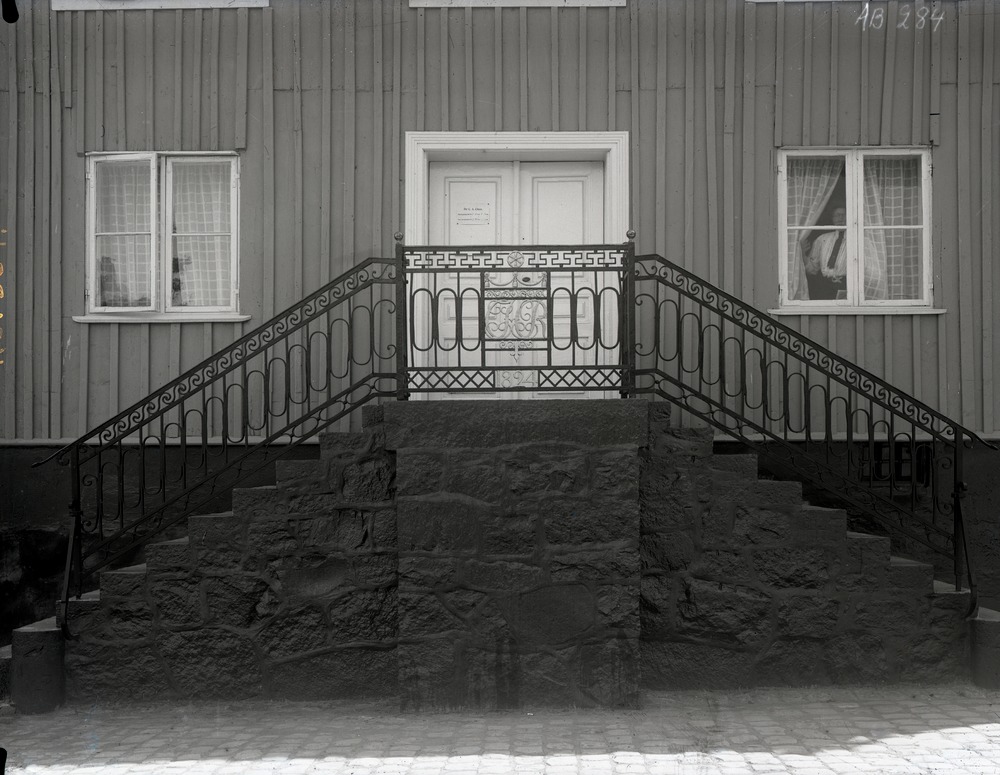 Fotografi av entrén till Tornérhjelmska huset. Huset står på en hög grund och fasaden är klädd med ljus träpanel. Dubbeltrappan, belägen på Fågelsångsgatans trottoar, leder upp till en vit dubbeldörr. Det mörka trappräcket är rikligt ornamenterat och i mitten av trappans topp, framför ytterdörrarna, finns initialer samt årtalet 1824. Ett fönster på vardera sida om ytterdörrarna syns i bilden. I fönstret till höger står en kvinna som håller undan gardinen och tittar ut mot fotografen.