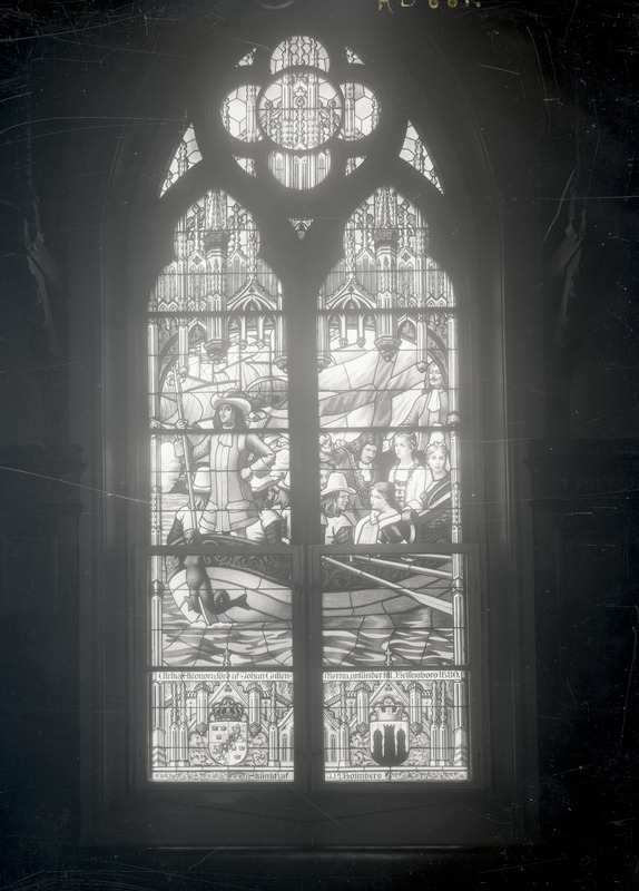 Rådhuset. Glasmålningen i fönstren, utförda efter kartongen av professorn m.m. friherre G. O. Cederström. Ulrika Eleonora anländer 1680.