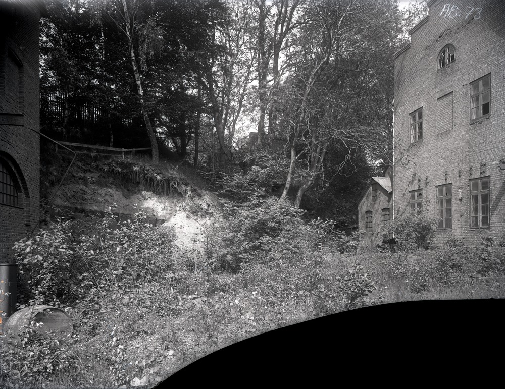 Fotografi av Hälsans gjuteri. En fabriksbyggnad syns till vänster och en annan till höger i bilden. Bakom byggnaden till höger ligger även en mindre byggnad. Mellan dem finns en bit mark som är överväxt med sly. I bakgrunden syns en del av Landborgen, en del träd, ett staket och en knappt synbar byggnad.