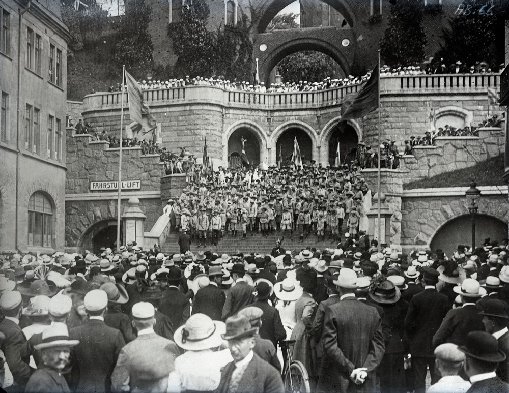 Fotografiet avbildar någon form av festlighet vid Terasstrapporna. I förgrunden, framför Terasstrapporna, står en folksamling som är vänd mot trapporna. Första delen av trapporna är fylld av barn. Längre upp ser det ut att vara vuxna eller möjligen ungdomar. Några flaggor och fanor syns bland barnen.