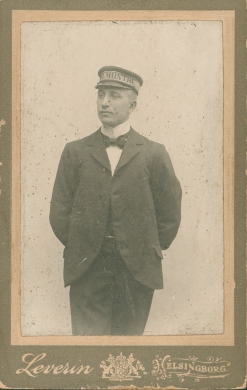 Porträtt av Janne Elof Jönsson. På ftografeit bär han kostym och en skärmmössa på vilken det står "MUNTHE".