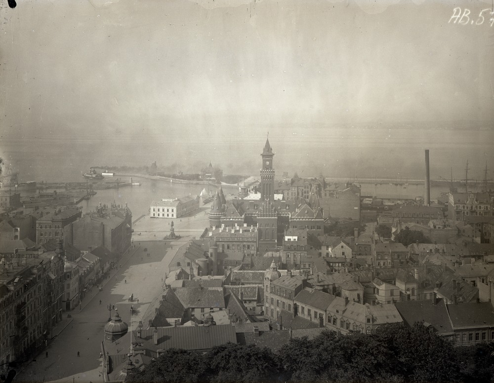 Fotografi av utsikt över delar av Helsingborgs stadskärna. Fotografiet är taget från Landborgen västerut. Till vänster i bild syns Stortorget, Tullhuset och hamnen. I mitten Rådhuset och till vänster därom Norra hamnen. I bakgrunden Öresund. Danmark är knappt synligt.