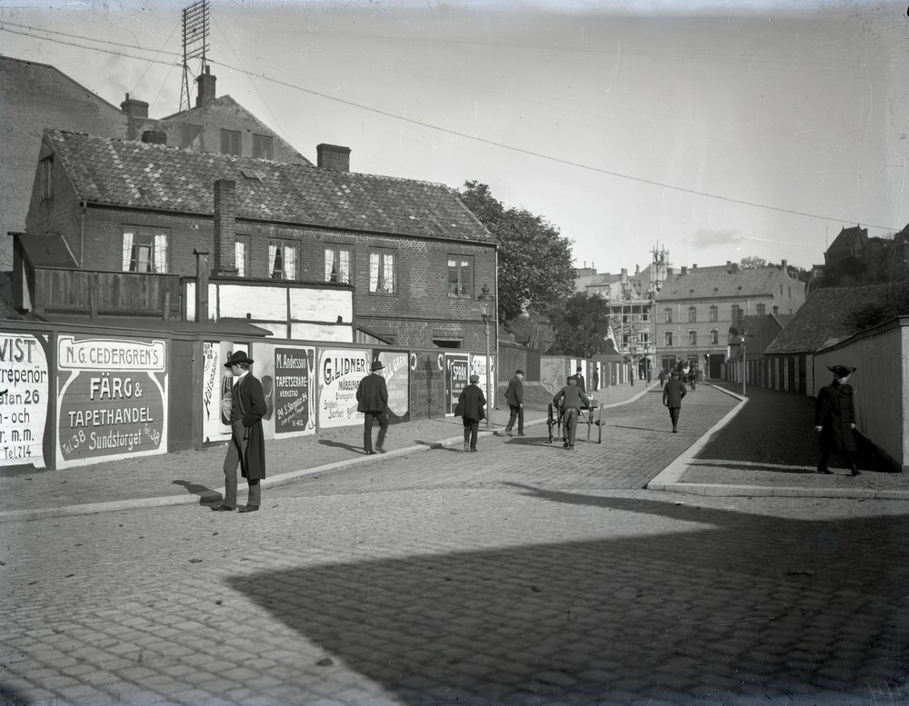 Fotografi av Carlsgatan taget åt nordost någon gång efter 1904–1905. Längs med gatan löper breda trottoarer på båda sidor. Det löper även plank med målad reklam på båda sidor. På vänster sida går det att se reklam för bland annat N.G. Cedergrens Färg & Tapethandel, M. Andersson Tapetserarverkstad och G. Lidner Möbelaffär. På gatan och trottoarerna rör sig ett antal män och pojkar. En pojke går med en kärra framför sig. Längre upp i gatan kommer ett ekipage med häst och vagn. På båda sidor gatan, och i bakgrunden, syns varierad stadsbebyggelse.