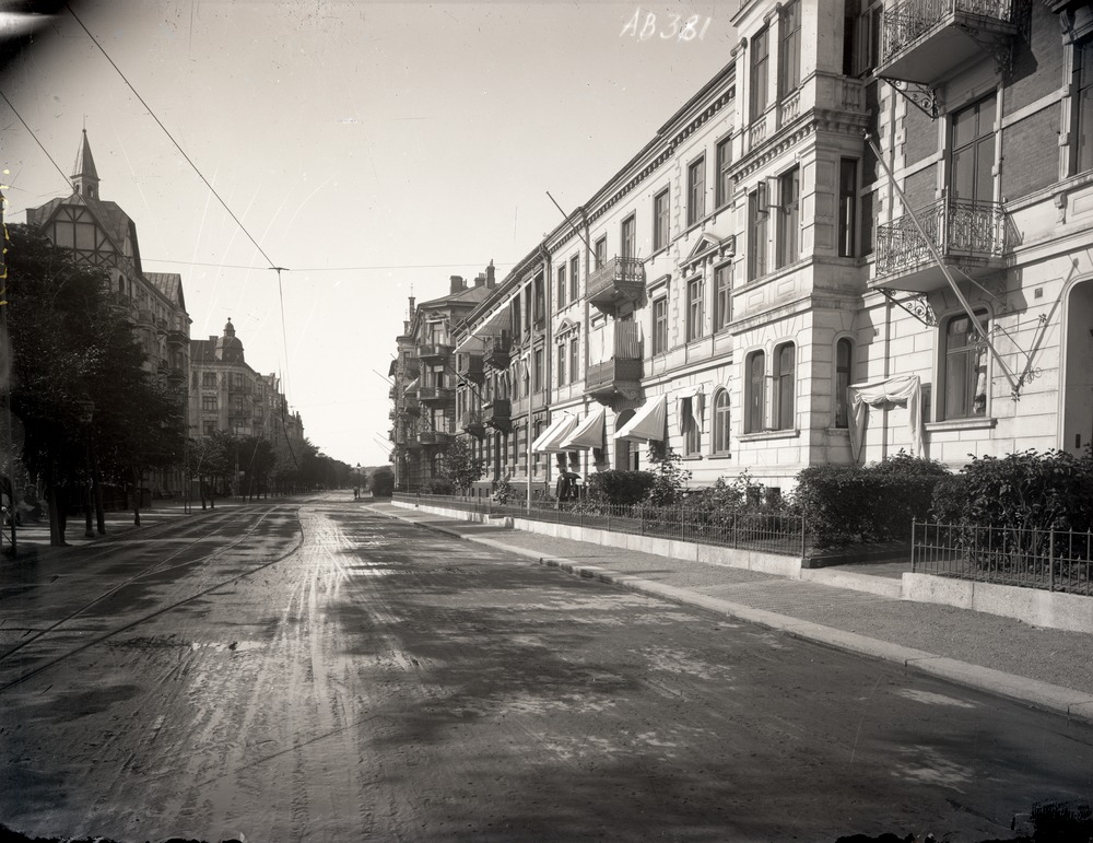 Fotografi, taget åt norr, av Drottninggatan. I förgrunden syns gatan men spårvägsspår och ledningar. På gatans västra sida, åt vänster i bild, står en rad med träd på trottoaren. Därefter ligger ett antal flervåningshus på rad. På östra sidan ligger flera sammanbyggda flervåningshus. Ett antal balkonger och flaggstänger syns på fasaderna. Över några fönster i bottenplan finns markiser. Framför husen har det anlagts små gräsmattor med bland annat rosenbuskar. Dessa avgränsas mot trottoaren av en låg mur med ett lågt staket ovanpå. Längre ner på gatan skymtar ytterligare några hus längs med Drottninggatan, främst hörnhuset Drottninggatan – Kronborgsgatan.
