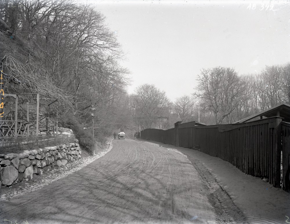 Fotografi av Hälsovägen taget åt öster. Till vänster skymtar trädgården som tillhör Hälsovägen 11. Denna avgränsas mot gatan med en stenmur. Därefter, uppåt i backen, finns en brant slänt täckt av träd. I bildens mitt löper Hälsovägen. På gatan, långt in i bilden, går en person bredvid ett ekipage med häst och vagn på väg upp för backen. Till höger i bild, längs med gatan, finns ett långt plank. I bakgrunden skymtar en byggnad samt fler träd.
