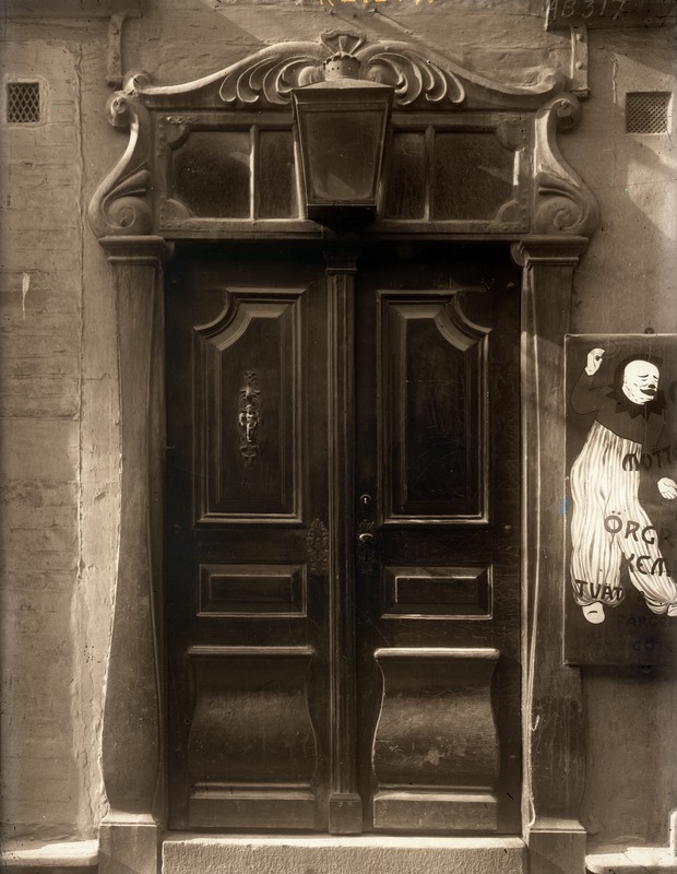 Fotografi av Gamlegårdens entrédörr på Norra Storgatan. Spegeldörren, som är dubbel, är ornamenterad och ovanför hänger en stor lykta. Till höger om dörren sitter en stor skylt som verkar vara reklam för ett tvätteri. På skylten finns en clown och halva ord, som "KEM...", "ÖRGR..." och " TVÄTT & FÄRGER", går att utläsa.
