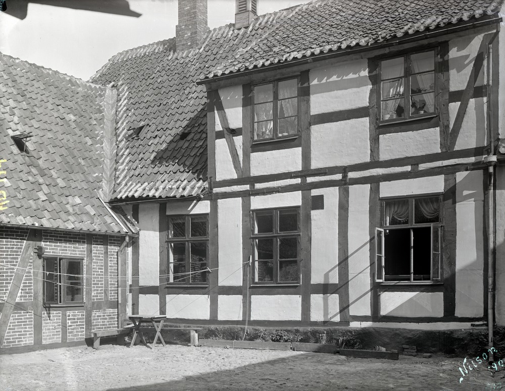 Fotografi av gårdsinteriören på den gamla prästgården på Prästgatan. Fotografiet visar ett hörn där ett tvåvåningshus i korsvirke och ett enplanshus, även det i korsvirke, möts. Till vänster i bild, mellan husen, har en tvättlina spänts upp. Under denna, precis i hörnet, står två enkla träbänkar och ett litet träbord. Gårdsplanen är belagd med kullersten.