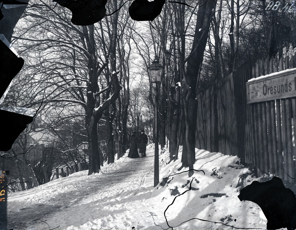 Fotografi taget i Öresundsparken innan Hälsovägen förändrades 1901. På marken och på trädgrenarna ligger snö. Mitt i bilden syns en gångväg omgiven av träd. Till höger om gångvägen står en lyktstolpe. Längre till höger går ett plank längs med gångvägen. På planket, i bildens förgrund, finns en skylt där det står "ÖresundsXX". Längre in i bild syns ett par, bakifrån, gående på gångvägen. Bakom träden skymtar byggnader i staden.