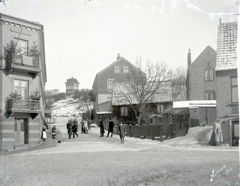 Fotografi av Tågagatan. Marken och hustaken är snötäckta. Förgrunden utgörs av en gatukorsning. Till vänster syns en del av ett trevåningshus med balkonger varpå det finns granar. På bottenplan finns en matvaru och diversehandel. Längre upp längs samma sida om gatan finns Cecilia Nilssons Hembageri. På gatan i mitten av bilden befinner sig ett antal personer, både män, kvinnor och barn. Till höger om gatan syns ett antal en- och flervåningshus samt ett staket och ett träd. I bakgrunden finns en slänt med ett lusthus.