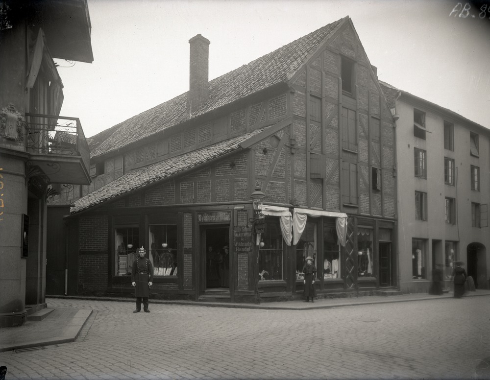 Fotografi av hörnet Strömgränden - Kullagatan. I förgrunden syns den stenlagda gatan. Till vänster skymtar byggnaden på Strömgrändens norra sida med balkonger på andra och tredje våningen. På gatan mellan husen står en uniformerad man, troligen en polis. I korsvirkesbyggnaden, på Strömgrändens södra sida, ligger Lilly Schult Manufaktur & Wäfnadshandel. I dörren skymtar tre kvinnor som står inne i butiken. På trottoaren står ytterligare en kvinna. Längst till höger i bild syns två kvinnor promenara söderut längs Kullagatan.