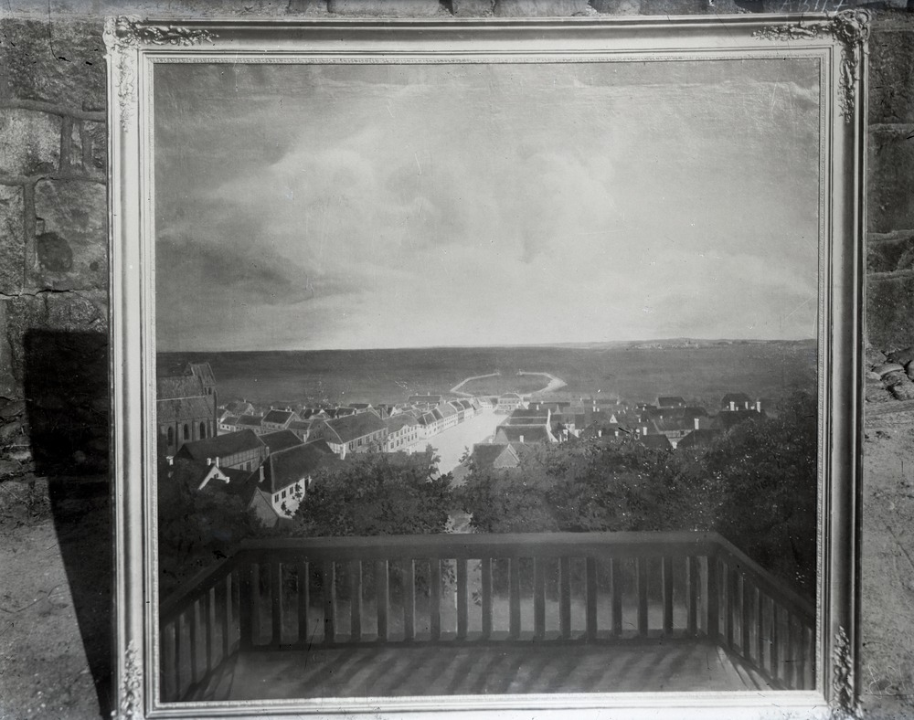 Dokumentationsfotografi av en oljemålning. Målningen avbildar centrala Helsingborg på 1850-talet. Målningen är inramad i en ram med dekorerade hörn. Fotografiet är taget utomhus och bakom målningen syns en stenmur.