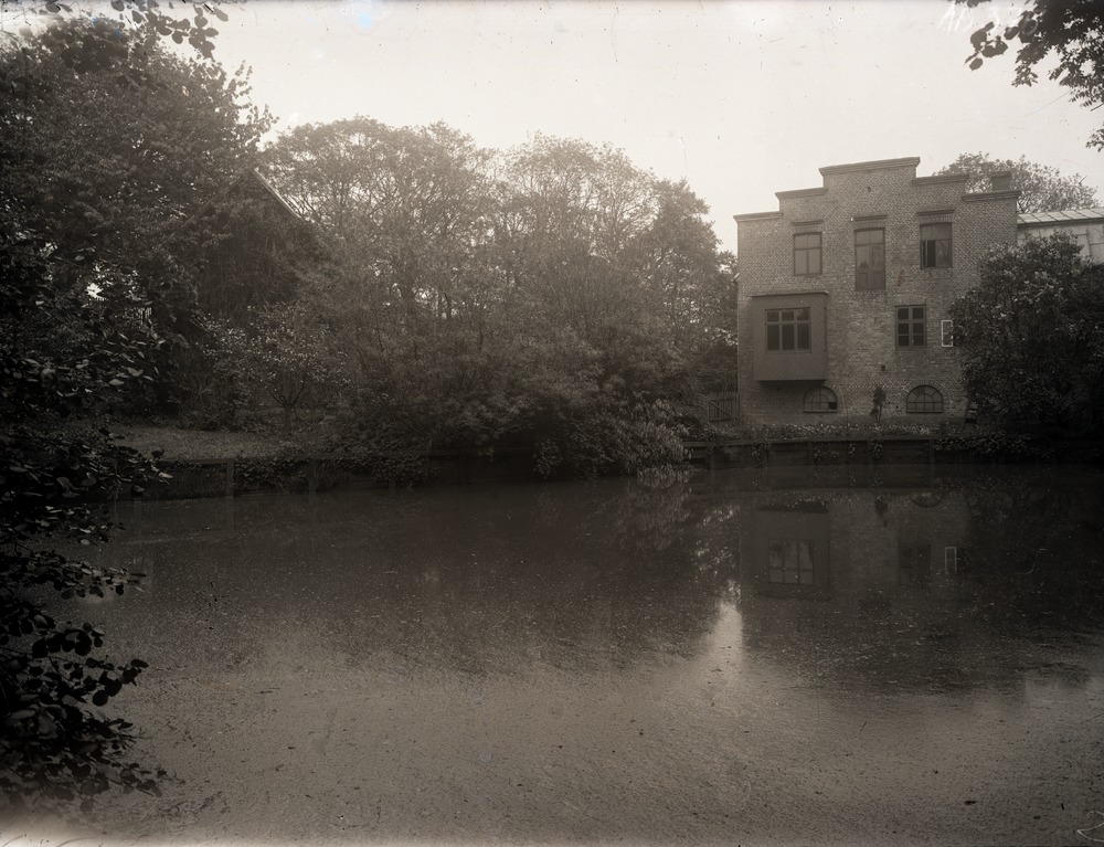 Fotografi som visar en del av Hälsans gjuteri. Byggnaden, placerad till höger i bild, var förvaltningsbyggnaden samt överingenjörens bostad. Till höger i bild ligger ytterligare en byggnad. Denna är till större delen dold av träd och buskar. I förgrunden ligger en damm.