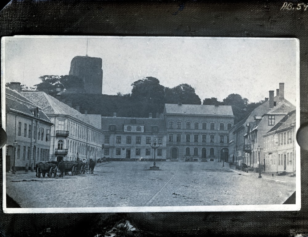 Avfotograferat fotografi av Stortorget med Landborgen och Kärnan i bakgrunden. På vänster sida av torget står några hästar och vagnar. Några personer befinner sig också på denna del av torget.