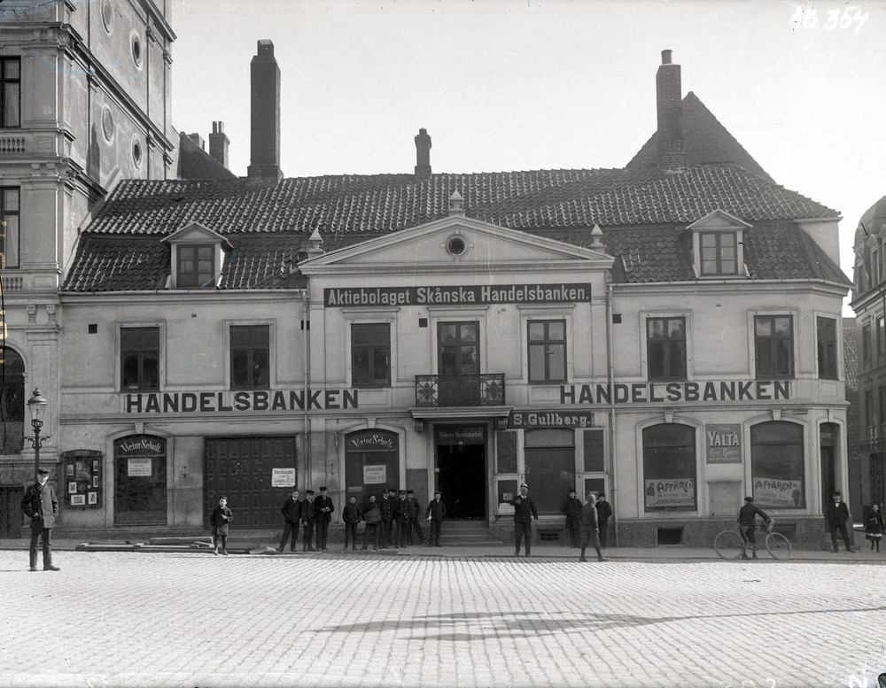 Fotografi av Aktiebolaget Skånska Handelsbankens byggnad på Stortorget. På andra våningen står det ”Aktiebolaget Skånska Handelsbanken.” målat på fasaden. Mellan bottenvåningen och andra våningen står det, på både fasadens vänstra och högra sida, står det målat ”Handelsbanken”. På bottenvåningen finns det i skyltfönstret till höger om entrén skyltar där det står ”Affären är flyttad till Jernvägsgatan 15. Mellan dem, på fasaden, finns en reklamskylt för cigaretter av märket Yalta. Intill entrén står det ”S. Gullberg” på en annan skylt. I skyltfönsterna på husets vänstra sida står det målat ”Victor Schult.” Dessutom finns det tre plakat där det står ”Victor Schultsaffär är flyttad till Kullagatan No 33” i fönsterna och på en port. Framför huset står en skara pojkar och en man i uniform. Till höger står en pojke med en cykel och på hörnet, längst till höger i bild, står en pojke och en flicka. De flesta personer i bild tittar mot fotografen.