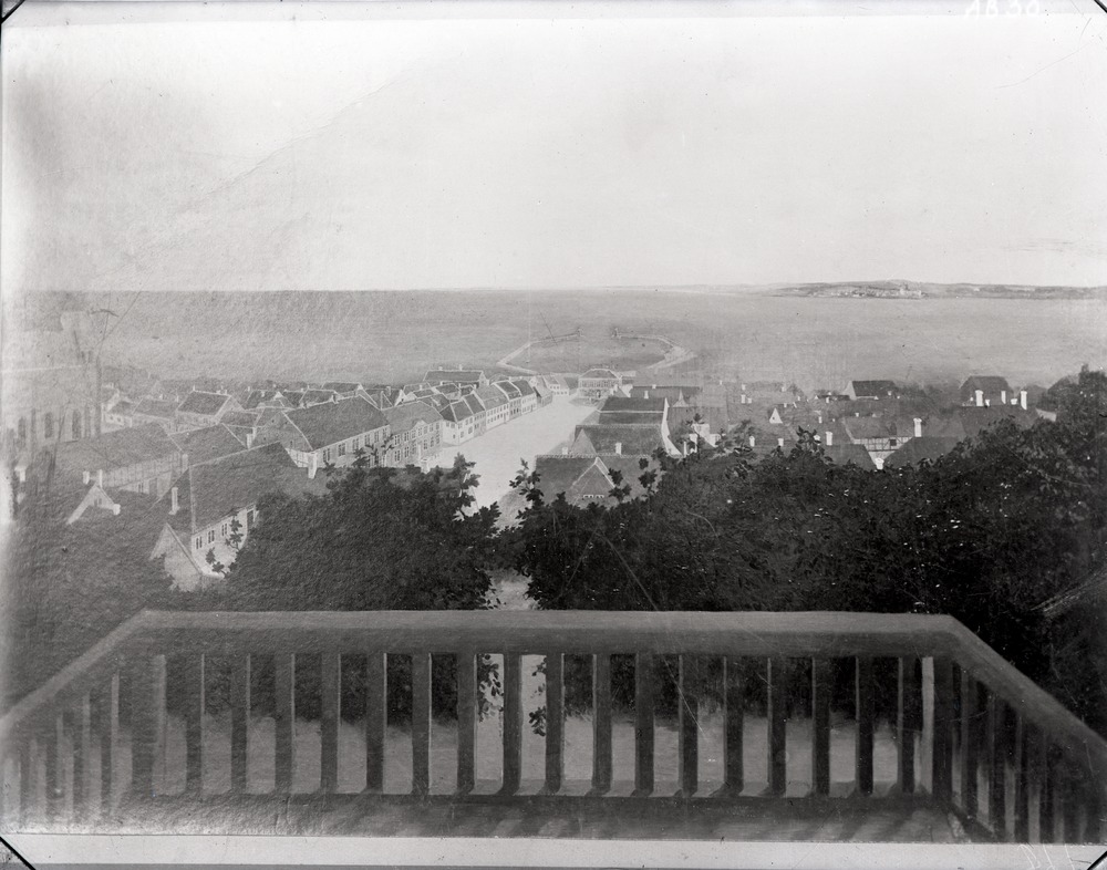 Avfotograferat fotografi som visar en målning av okänd konstnär. Målningen visar utsikten över Helsingborgs stadskärna uppifrån Landborgen. I mitten syns Stortorget och Gamla Rådhuset, och bakom detta hamnen. Danmark skymtas på andra sidan sundet.